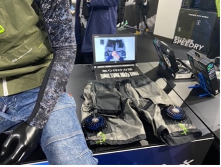 例年、各メーカーのデザインがスポーティかつカジュアル化していく中、今年の「G.G」の空調服はその中でも群を抜いてスポーツに振り切った仕上がり。機能性もしっかりと担保された上で、スポーツシーンでも活用できる「動きやすさや着心地」から今年の空調服市場において、注目したいシリーズです。ファン4台を一気に回すパワフルなデバイスも展示会場で注目を集めていました。