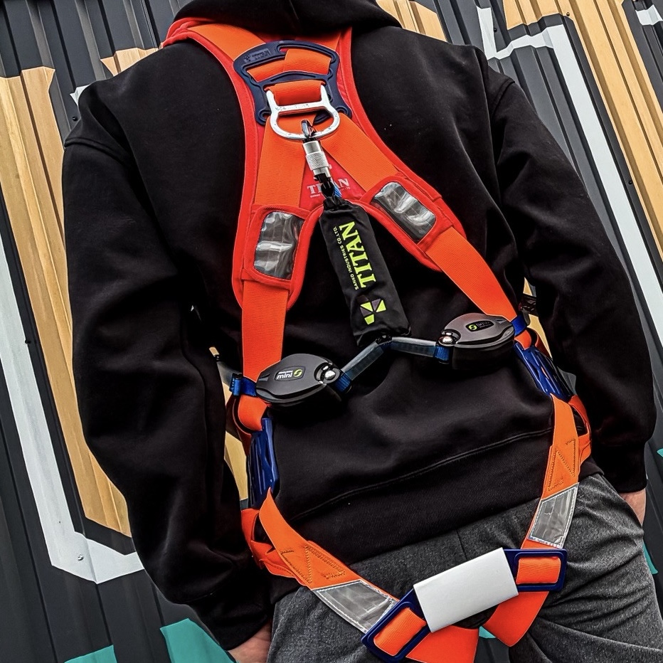 作業服専門店だいまつネットストア >アイテムから選ぶ >タイタン PANGAEA CANYON 高視認フルハーネス PCHV-10A型(オレンジ)&タイタン REELOCK mini(リーロックミニ)ダブル フルハーネス/胴ベルト兼用巻取式ランヤード(第1種・ロック装置付)。