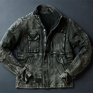 「CORDURA®︎」ブラックデニムにベース加工を施し、強いパウダー系ケミカル加工にて細かいムラになるよう脱色ブリーチ。更に、黒味の光沢が出る樹脂で全面に高圧プレスコーティング。 独自のピンワークにより黒味を強調し、ユーズド感と動きを演出している。