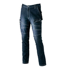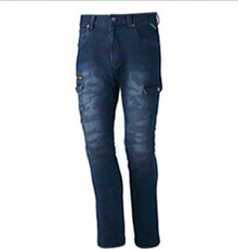 胸元のファスナーとライダースデザインがポイントの春夏デニム作業服。